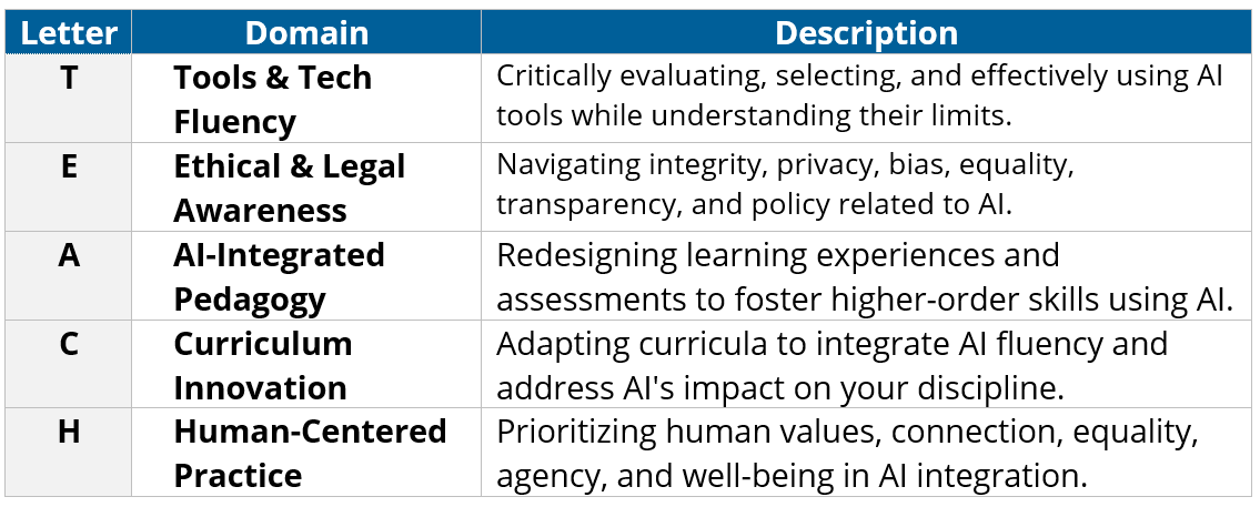 TEACH is the faculty-practice architecture behind the certification pathway, using the v1.1 domains for workflows, governance, pedagogy, curriculum agility, and human essentialism. fileciteturn21file10turn21file11