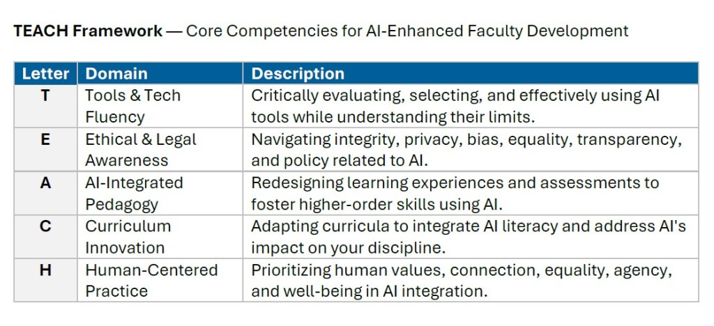 TEACH is not another top-down mandate. It’s a faculty-first framework for making strategic, defensible decisions about AI in your classroom and your career. It’s a compass for the intellectually serious educator navigating the fog.